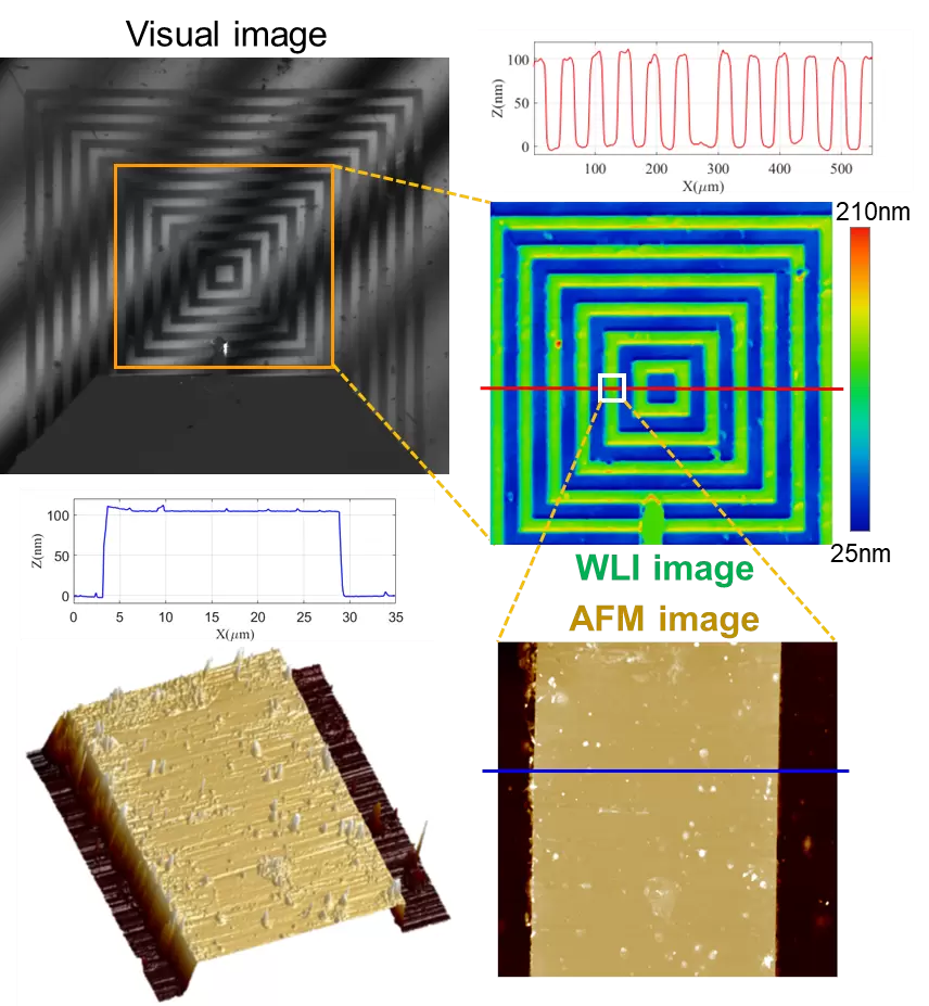 In certain applications where users require both large-scale rapid measurements and small-scale high-resolution measurements, the AFM-WLI Duet provides a convenient cross-scale measurement solution. It utilizes WLI for large-scale rapid measurements and AFM for small-area high-resolution measurements. The combination of both offers users a convenient in-situ cross-scale topography characterization solution.