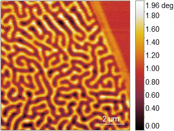 As shown in the following figure, this is an image of the magnetic domain distribution in a certain 2D material with 10 μm scan range. The "maze-like" distribution of magnetic domains inside the material can be clearly seen in the image.